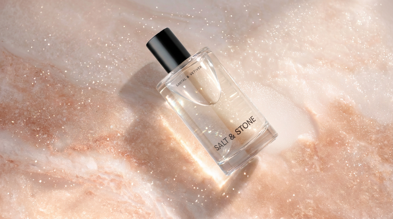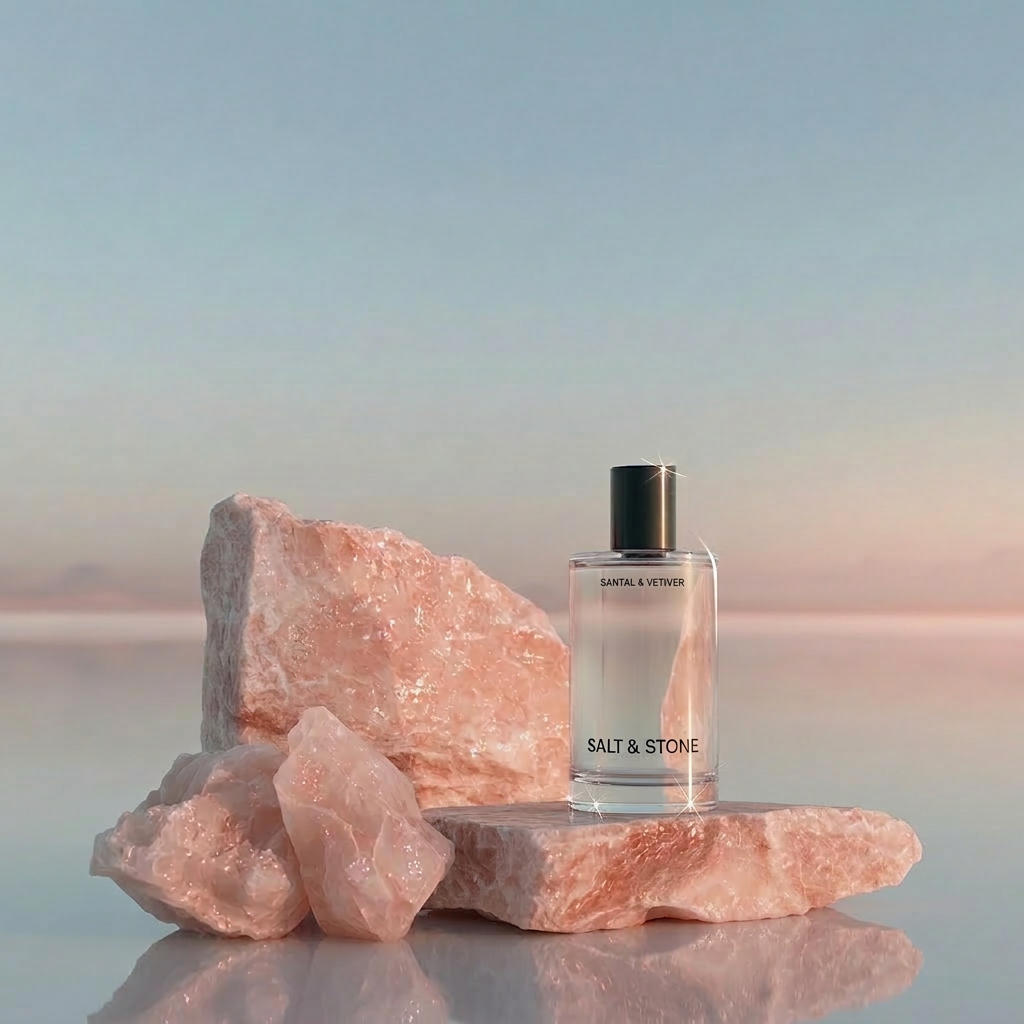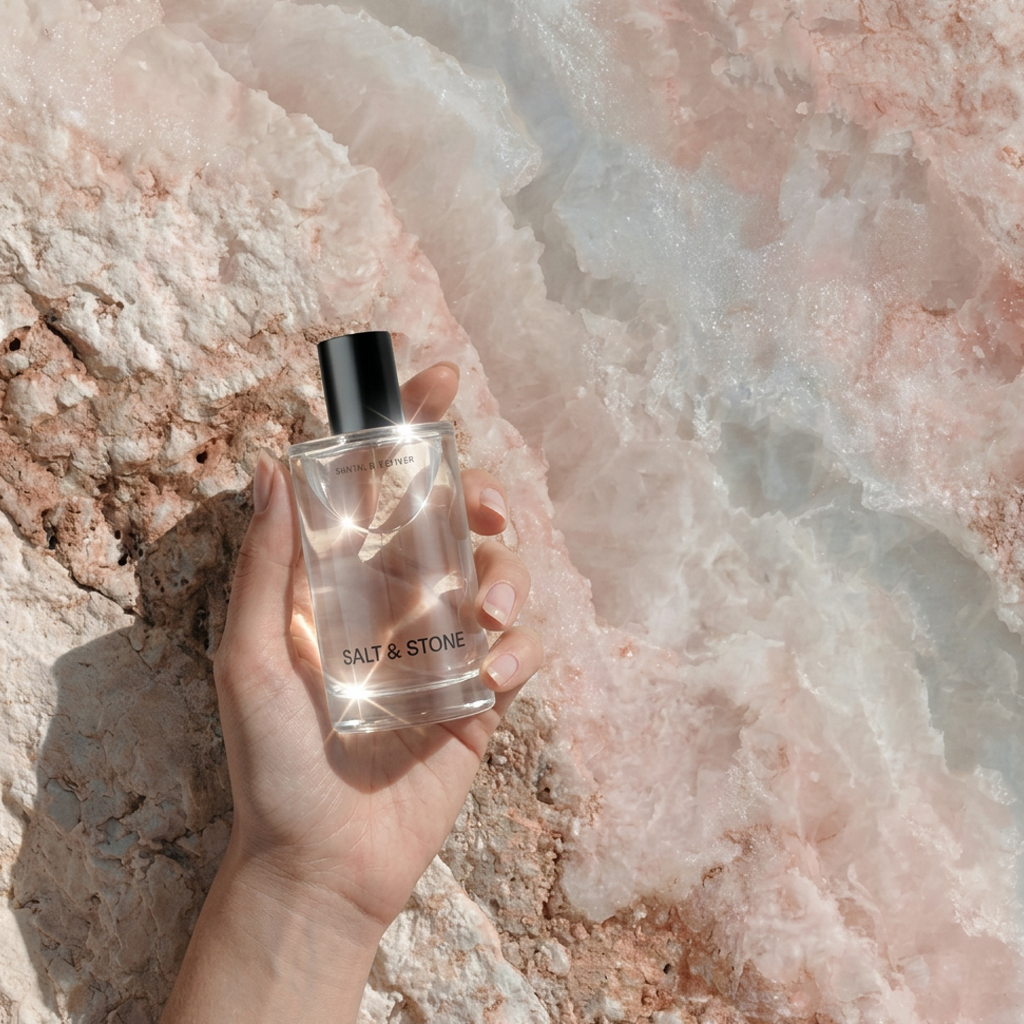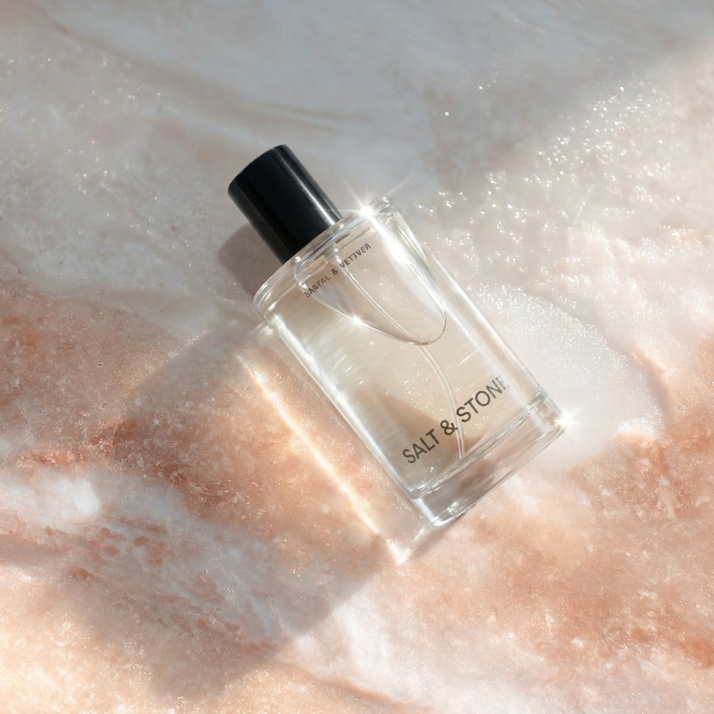 High-end editorial fragrance photography, slightly low and intimate angle with balanced negative space. Soft side natural light creates crisp highlights on the glass, illuminates the liquid, and reveals texture in the stone, with subtle sparkle in the salt crystals.