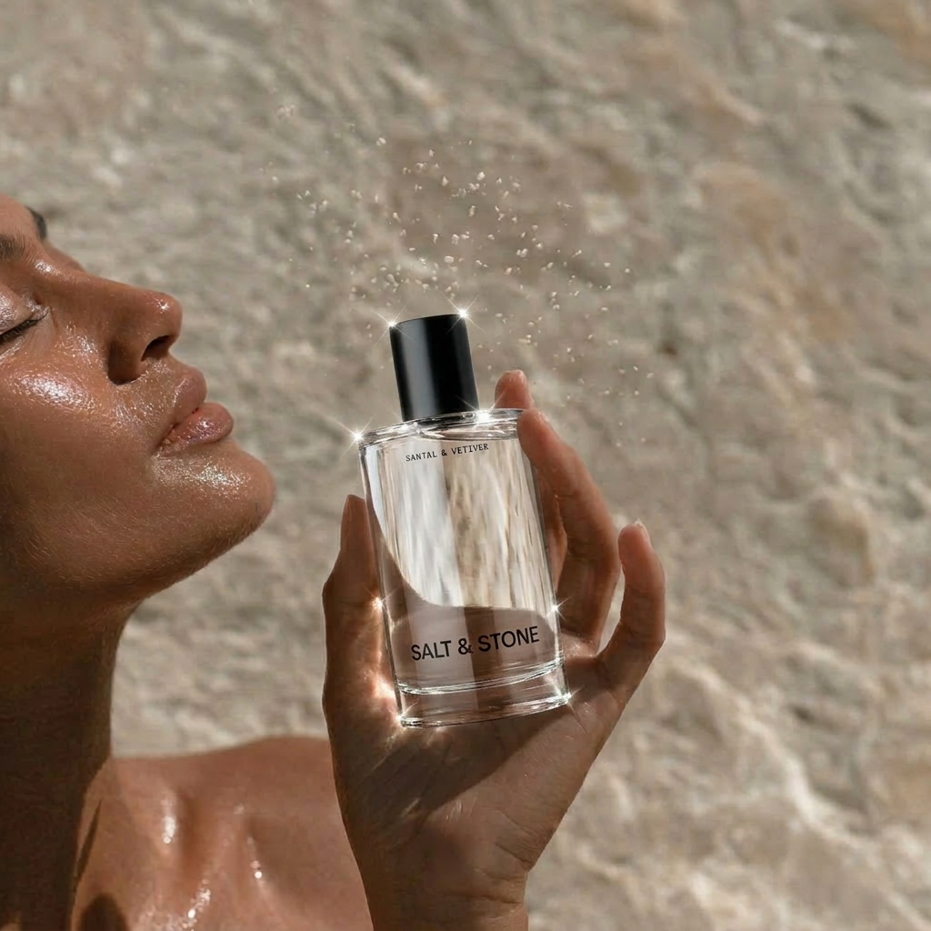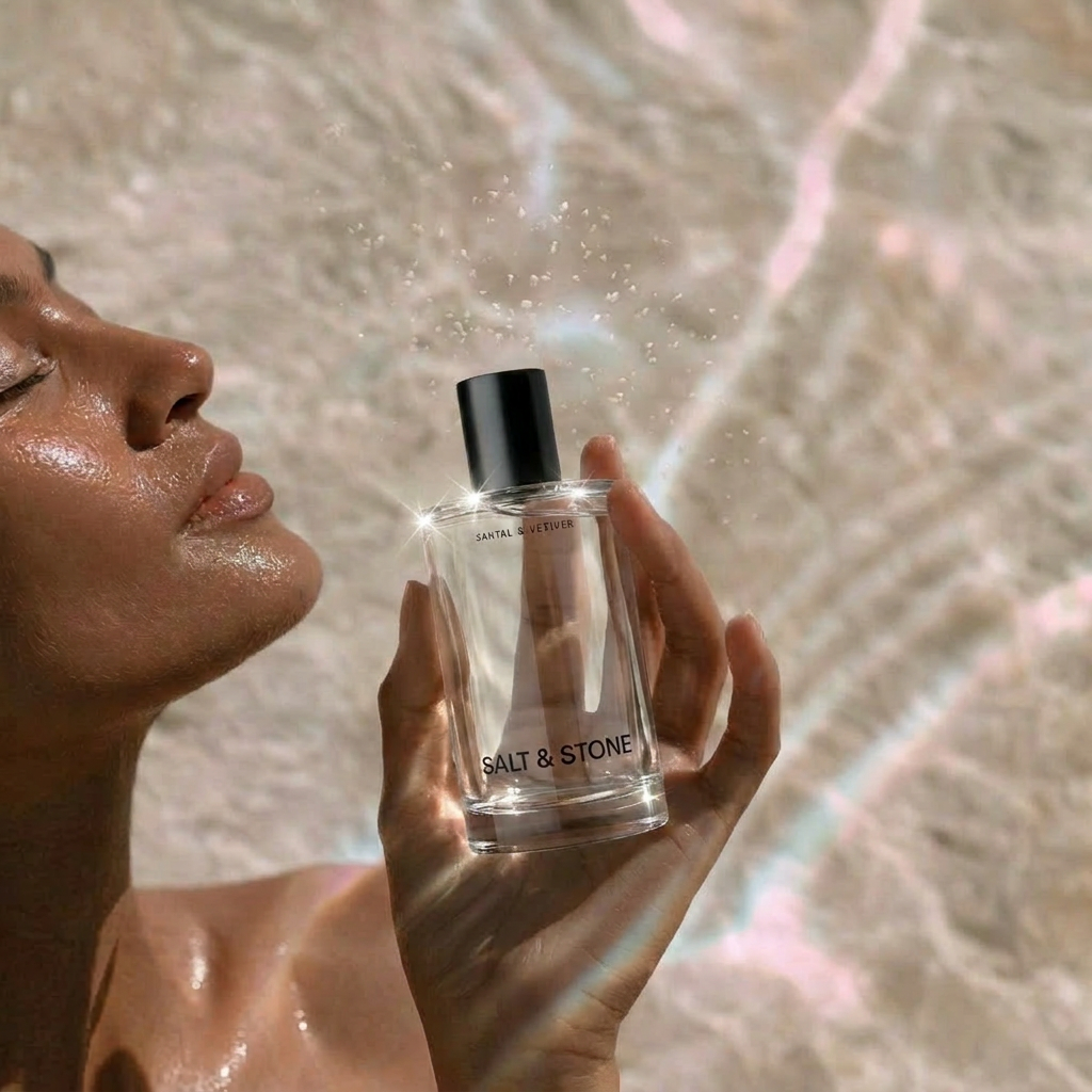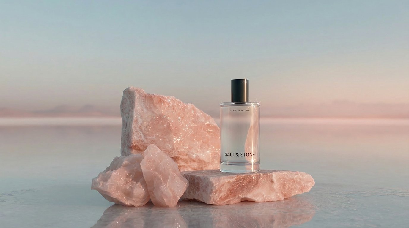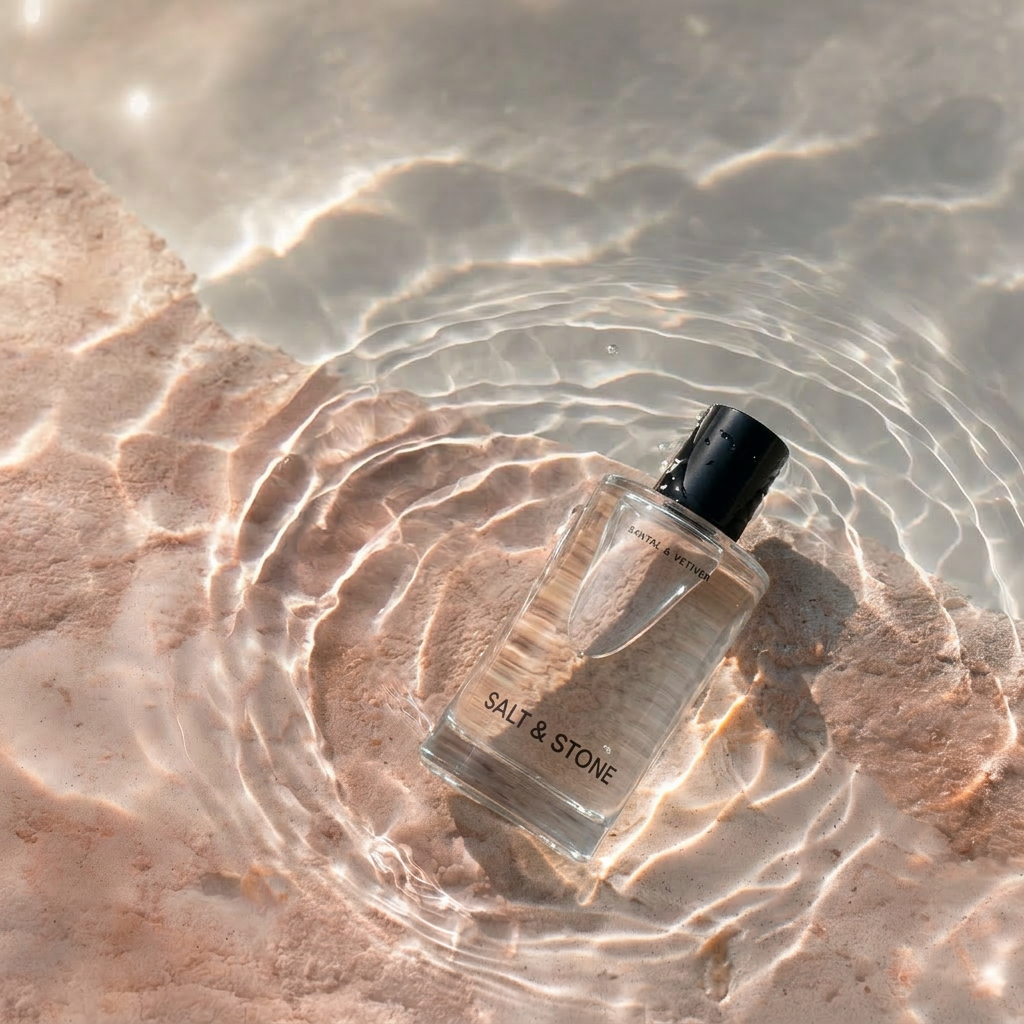 High-end editorial fragrance photography, slightly low and intimate angle with balanced negative space. Soft side natural light creates crisp highlights on the glass, illuminates the liquid, and reveals texture in the stone, with subtle sparkle in the salt crystals.
