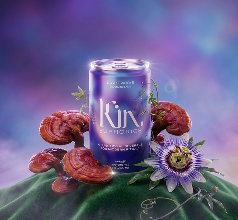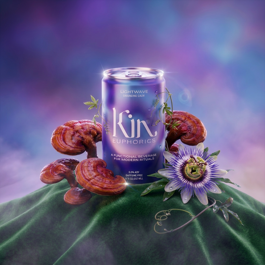 Iridescent Kin Euphorics can in deep indigo and violet tones, centered on a softly draped velvety surface. Surrounded by sculptural reishi mushrooms and a delicate passion flower vine wrapping around the product.