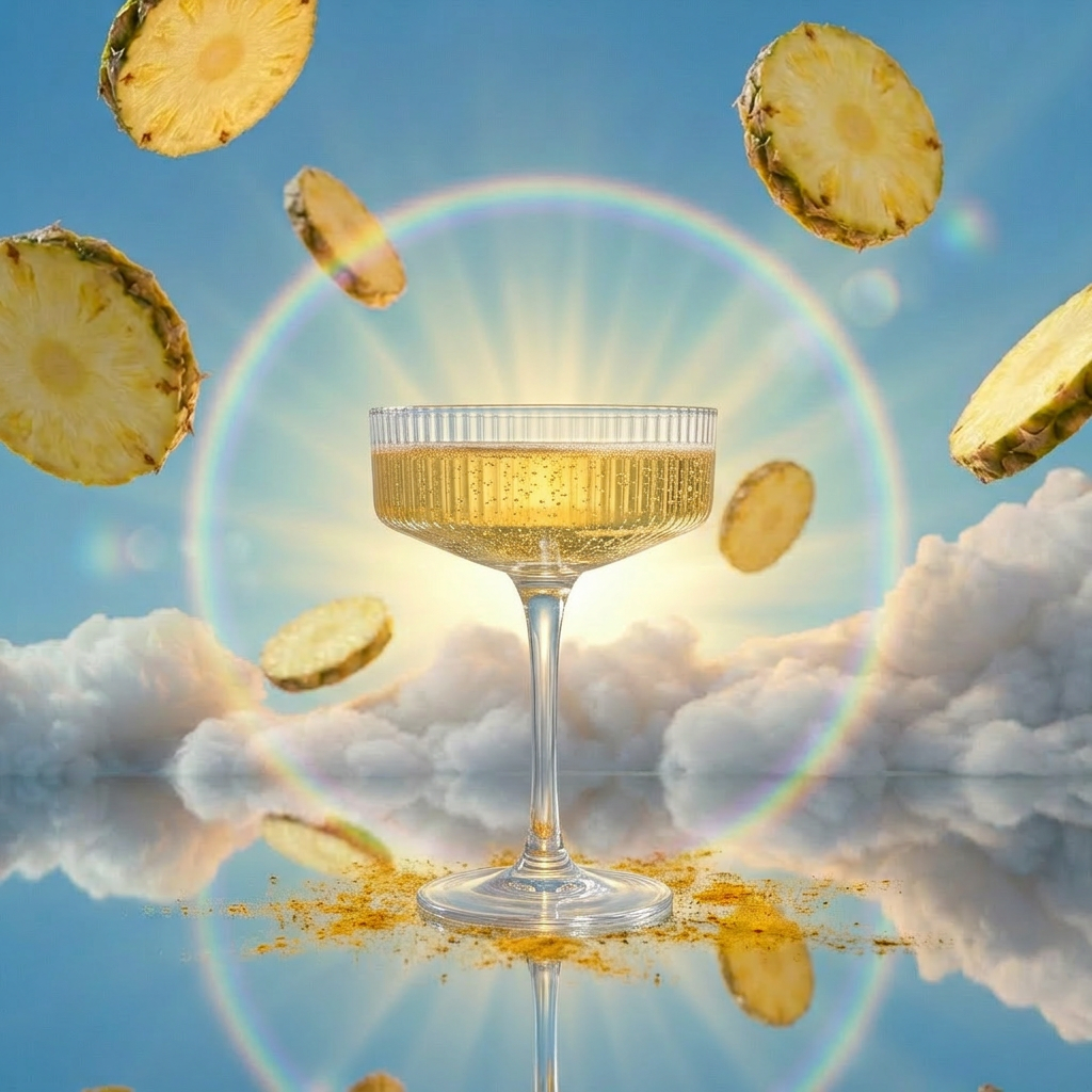 Sleek aluminum can with a warm golden gradient finish and fine condensation, positioned atop soft sculptural clouds. Surrounded by a radiant halo of light and subtle lens flare, creating a luminous focal point.